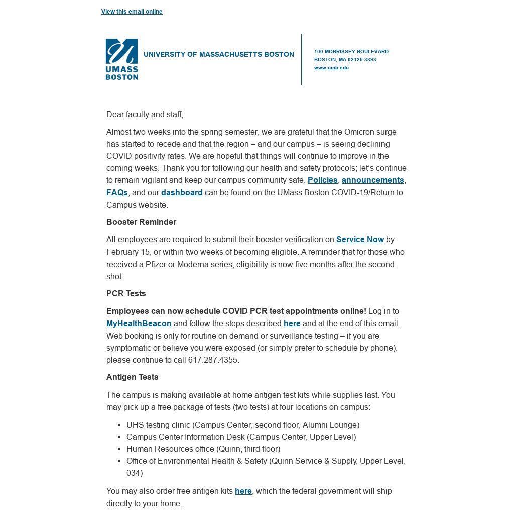 Almost two weeks into the spring semester, we are grateful that the Omicron surge has started to recede and that the region – and our campus – is seeing declining COVID positivity rates. We are hopeful that things will continue to improve in the coming weeks. Thank you for following our health and safety protocols; let’s continue to remain vigilant and keep our campus community safe. Policies, announcements, FAQs, and our dashboard can be found on the UMass Boston COVID-19/Return to Campus website.