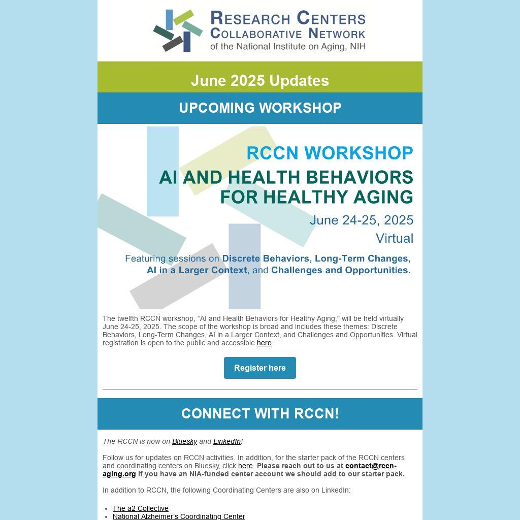 Follow us for updates on RCCN activities. In addition, for the starter pack of the RCCN centers and coordinating centers on Bluesky, click here. Please reach out to us at contact@rccn-aging.org if you have an NIA-funded center account we should add to our starter pack.