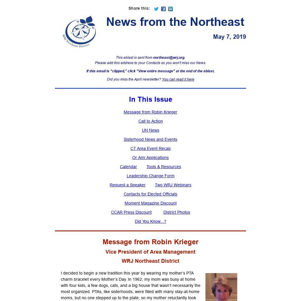 True confession. Like my mother, I was not excited about becoming an officer of PTA or of sisterhood. Both organizations were in need of new leaders, and I had no intention of being one of them. As for PTA, I aged out once my kids did. But sisterhood was different; it became even more important to me after the kids left. Who knew that becoming temple sisterhood president would lead me to roles within both the Northeast District and WRJ, and expand my leadership skills beyond my expectations?