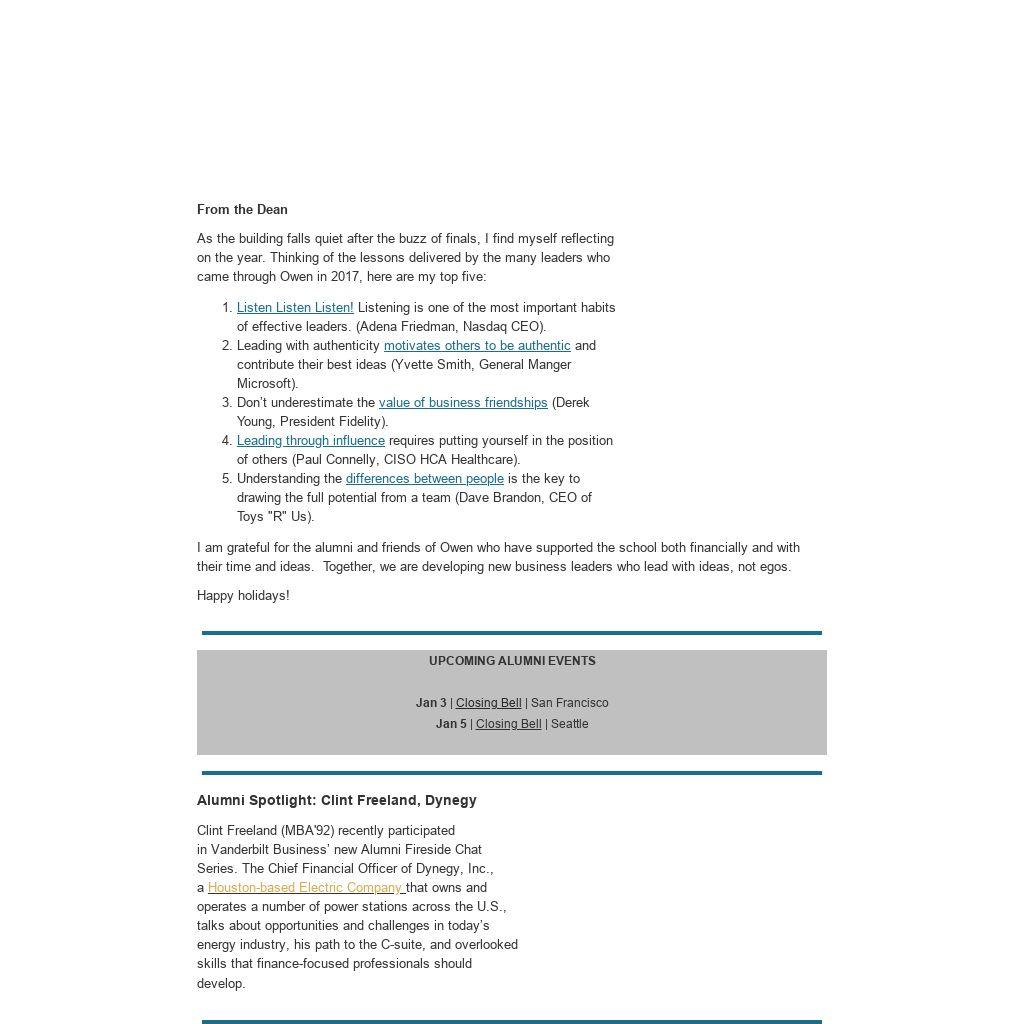 From the Dean As the building falls quiet after the buzz of finals, I find myself reflecting on the year. Thinking of the lessons delivered by the many leaders who came through Owen in 2017, here are my top five: - Listen Listen Listen! Listening is one of the most important habits of effective leaders. (Adena Friedman, Nasdaq CEO).