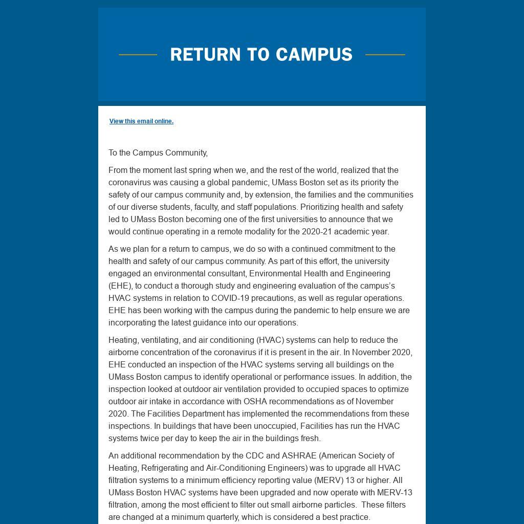 As we plan for a return to campus, we do so with a continued commitment to the health and safety of our campus community. As part of this effort, the university engaged an environmental consultant, Environmental Health and Engineering (EHE), to conduct a thorough study and engineering evaluation of the campus’s HVAC systems in relation to COVID-19 precautions, as well as regular operations. EHE has been working with the campus during the pandemic to help ensure we are incorporating the latest guidance into our operations.