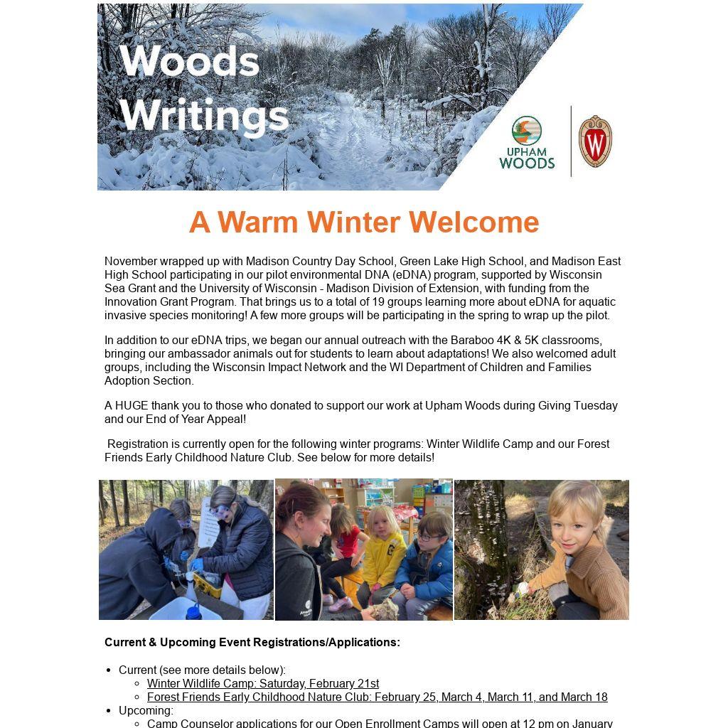 | Youth will explore Wisconsin Winter Wildlife at Upham Woods! Drop your youth off for winter fun with the Upham Woods Outdoor Educators!