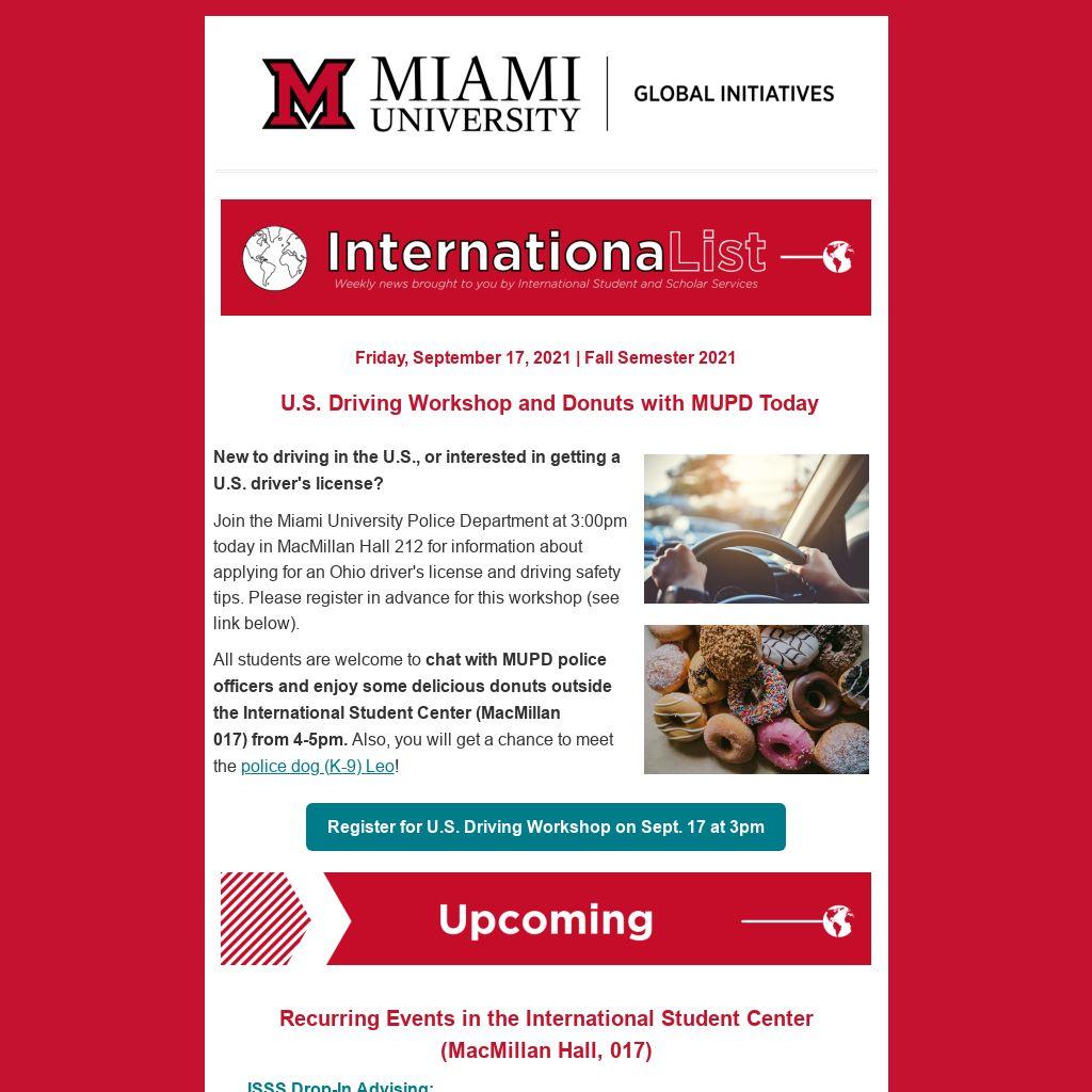 Join the Miami University Police Department at 3:00pm today in MacMillan Hall 212 for information about applying for an Ohio driver's license and driving safety tips. Please register in advance for this workshop (see link below).