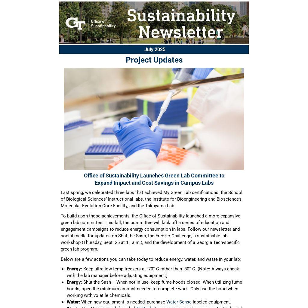 To build upon those achievements, the Office of Sustainability launched a more expansive green lab committee. This fall, the committee will kick off a series of education and engagement campaigns to reduce energy consumption in labs. Follow our newsletter and social media for updates on Shut the Sash, the Freezer Challenge, a sustainable lab workshop (Thursday, Sept. 25 at 11 a.m.), and the development of a Georgia Tech-specific green lab program.