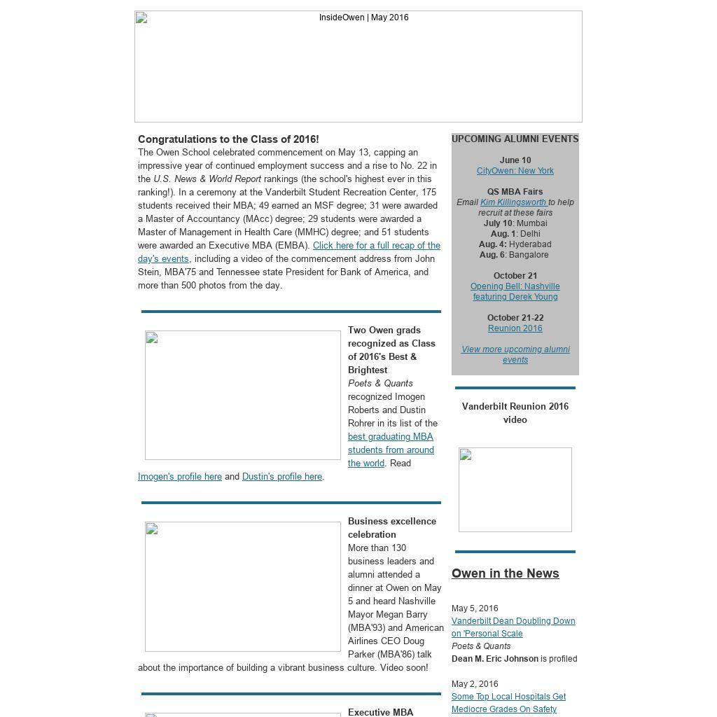 U.S. News & World Report rankings (the school's highest ever in this ranking!). In a ceremony at the Vanderbilt Student Recreation Center, 175 students received their MBA; 49 earned an MSF degree; 31 were awarded a Master of Accountancy (MAcc) degree; 29 students were awarded a Master of Management in Health Care (MMHC) degree; and 51 students were awarded an Executive MBA (EMBA).