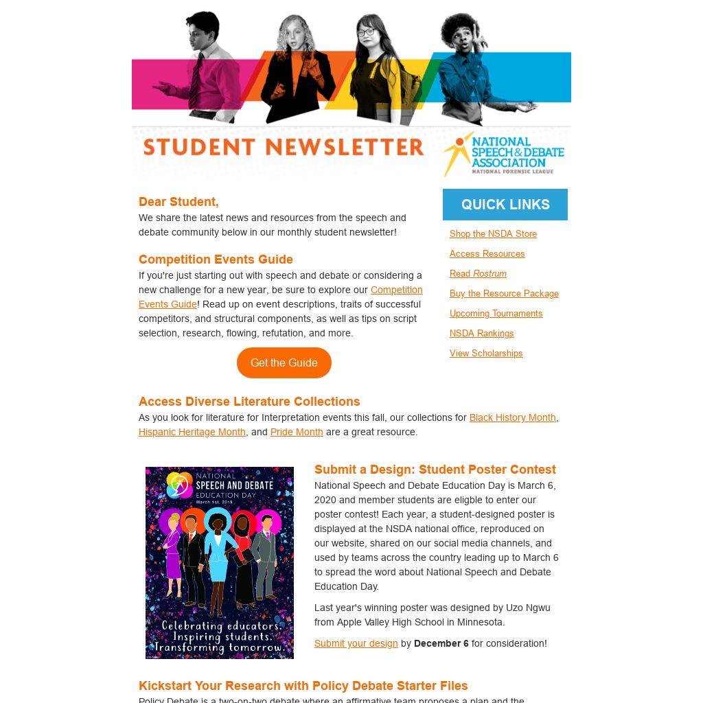 National Speech and Debate Education Day is March 6, 2020 and member students are eligble to enter our poster contest! Each year, a student-designed poster is displayed at the NSDA national office, reproduced on our website, shared on our social media channels, and used by teams across the country leading up to March 6 to spread the word about National Speech and Debate Education Day.