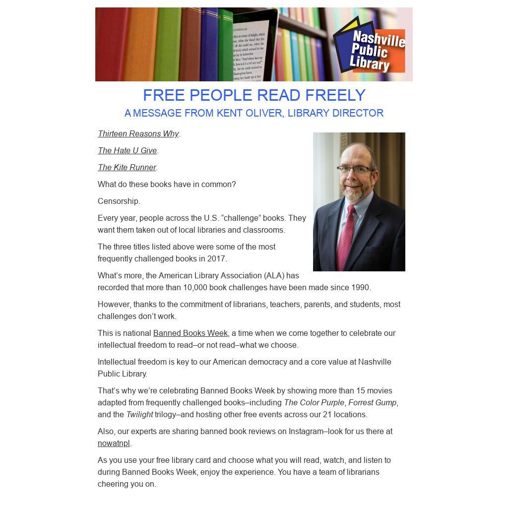 This is national Banned Books Week, a time when we come together to celebrate our intellectual freedom to read–or not read–what we choose. Intellectual freedom is key to our American democracy and a core value at Nashville Public Library.