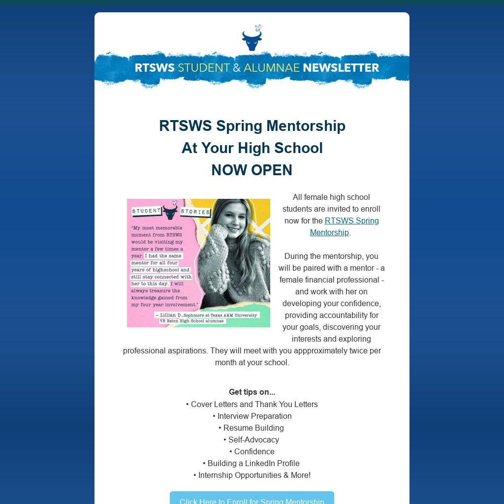 If you are just now tuning in, the RTSWS Student and Alumnae Newsletter is for all current and former RTSWS students. Whether you are still in high school, checking in from college or finding your way in the industry, RTSWS is here to support you in your personal finance and career journey!