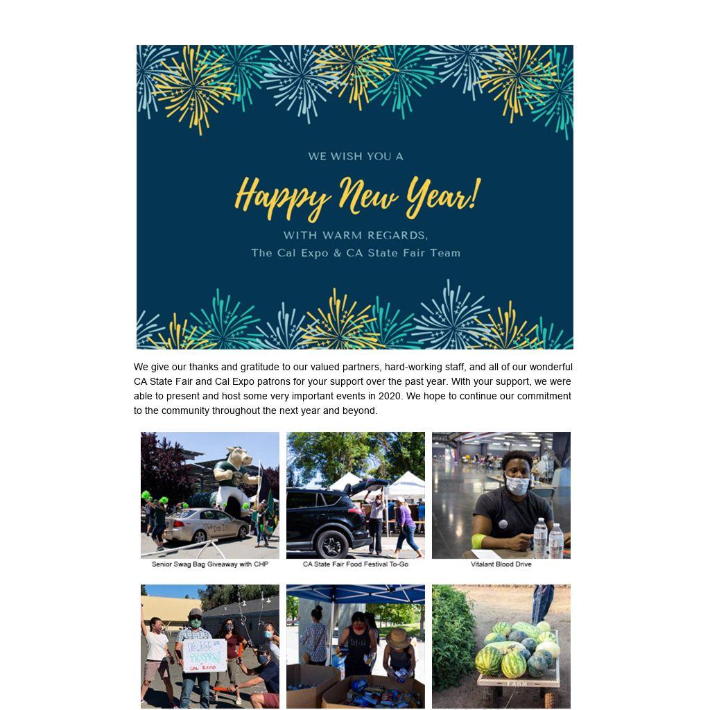We give our thanks and gratitude to our valued partners, hard-working staff, and all of our wonderful CA State Fair and Cal Expo patrons for your support over the past year. With your support, we were able to present and host some very important events in 2020. We hope to continue our commitment to the community throughout the next year and beyond.