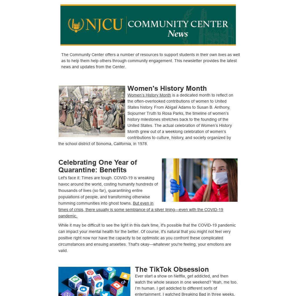 The Community Center offers a number of resources to support students in their own lives as well as to help them help others through community engagement. This newsletter provides the latest news and updates from the Center.