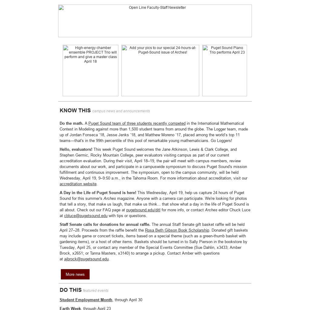 Staff Senate calls for donations for annual raffle. The annual Staff Senate gift basket raffle will be held April 27–28. Proceeds from the raffle benefit the Rosa Beth Gibson Book Scholarship. Donated gift baskets may include game or concert tickets, items based on a special theme (such as a green-thumb basket with gardening items), or a host of other items. Baskets should be turned in to Sally Pierson in the bookstore by Tuesday, April 25, or contact any member of the Special Events Committee (Sue Dahlin, x3433; Amber Brock, x2651; or Tanna Masters, x3140) to arrange a pickup. Contact Amber with questions at ajbrock@pugetsound.edu.