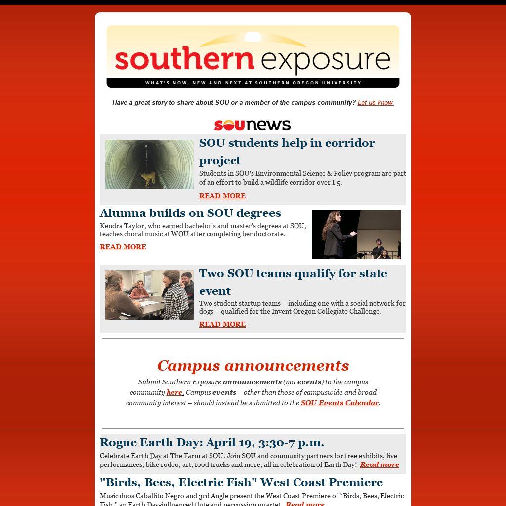 Submit Southern Exposure announcements (not events) to the campus community here. Campus events – other than those of campuswide and broad community interest – should instead be submitted to the SOU Events Calendar.