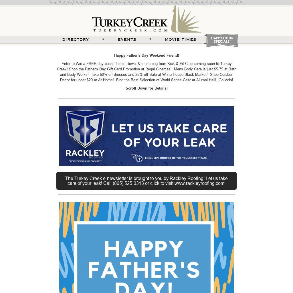 Enter to Win a FREE day pass, T-shirt, towel & mesh bag from Kick & Fit Club coming soon to Turkey Creek! Shop the Father's Day Gift Card Promotion at Regal Cinemas! Mens Body Care is just $5.75 at Bath and Body Works! Take 50% off dresses and 25% off Sale at White House Black Market! Shop Outdoor Decor for under $20 at At Home! Find the Best Selection of World Series Gear at Alumni Hall! Go Vols!