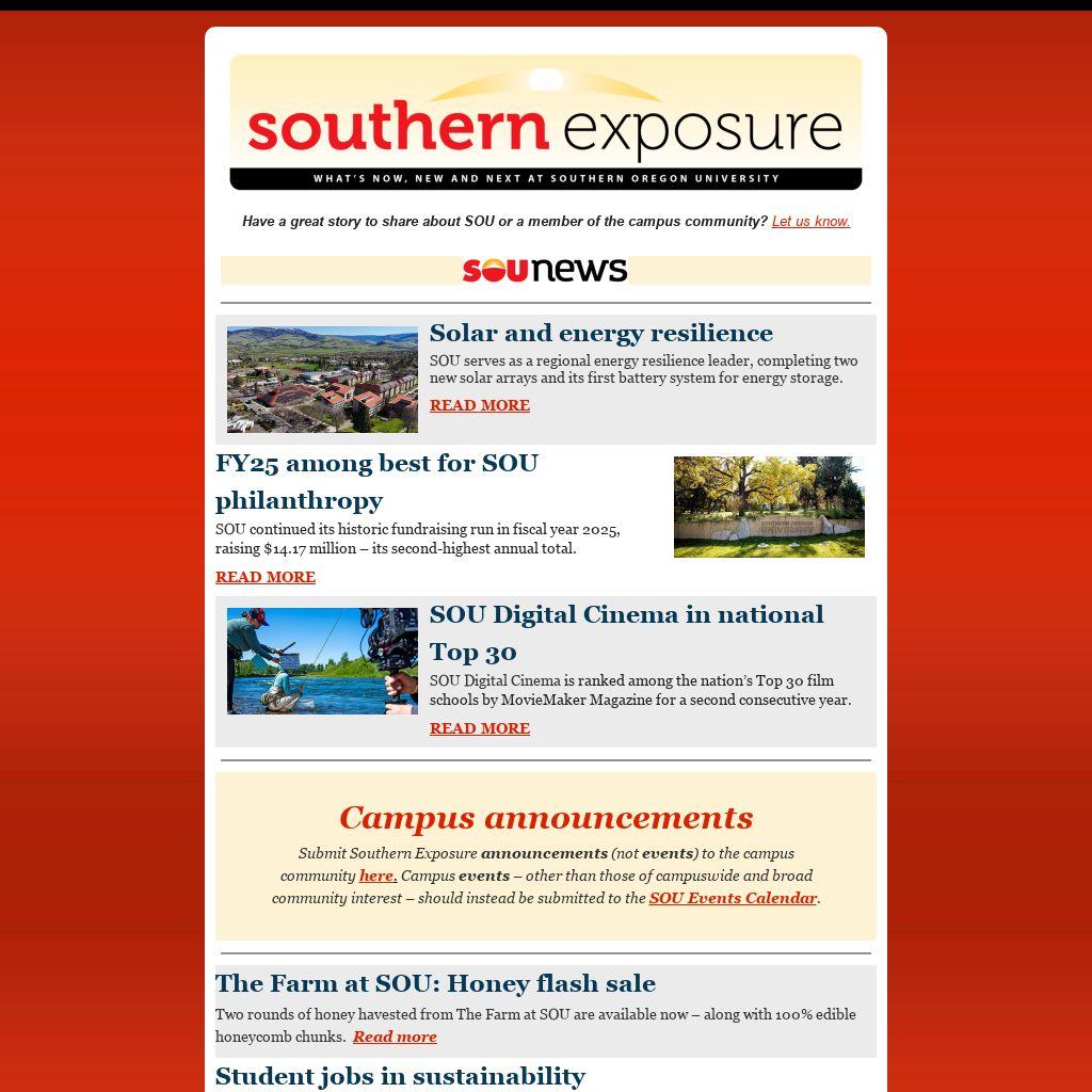 Submit Southern Exposure announcements (not events) to the campus community here. Campus events – other than those of campuswide and broad community interest – should instead be submitted to the SOU Events Calendar.