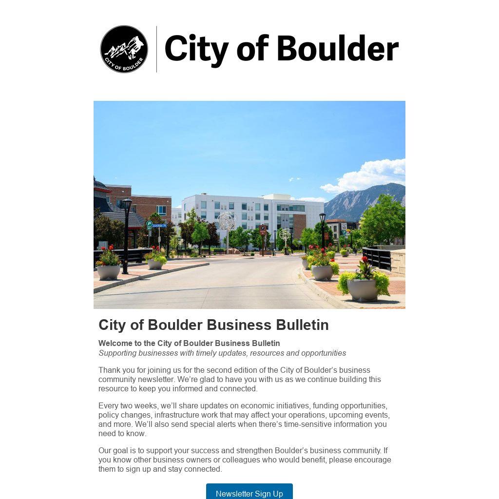 Thank you for joining us for the second edition of the City of Boulder’s business community newsletter. We’re glad to have you with us as we continue building this resource to keep you informed and connected.
