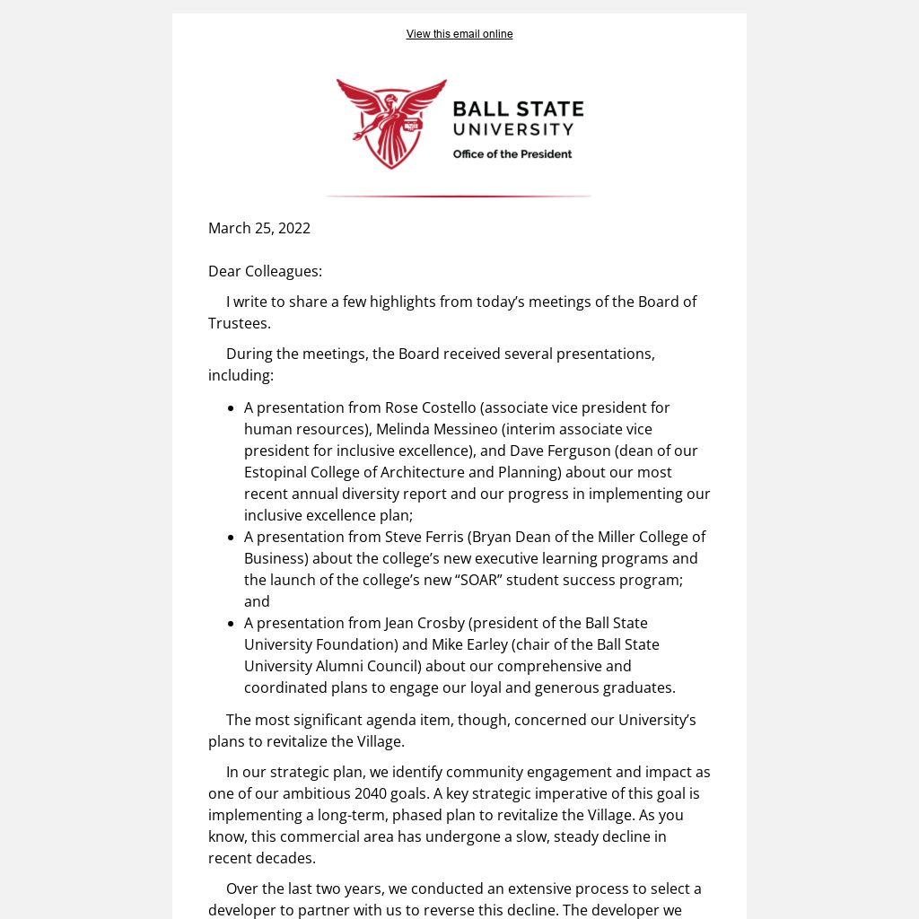 - A presentation from Jean Crosby (president of the Ball State University Foundation) and Mike Earley (chair of the Ball State University Alumni Council) about our comprehensive and coordinated plans to engage our loyal and generous graduates.