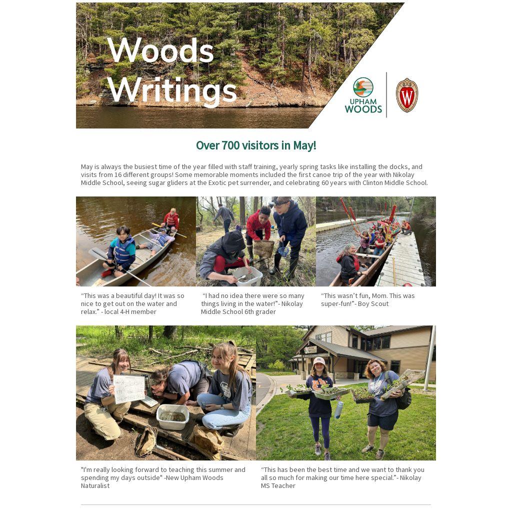 May is always the busiest time of the year filled with staff training, yearly spring tasks like installing the docks, and visits from 16 different groups! Some memorable moments included the first canoe trip of the year with Nikolay Middle School, seeing sugar gliders at the Exotic pet surrender, and celebrating 60 years with Clinton Middle School.