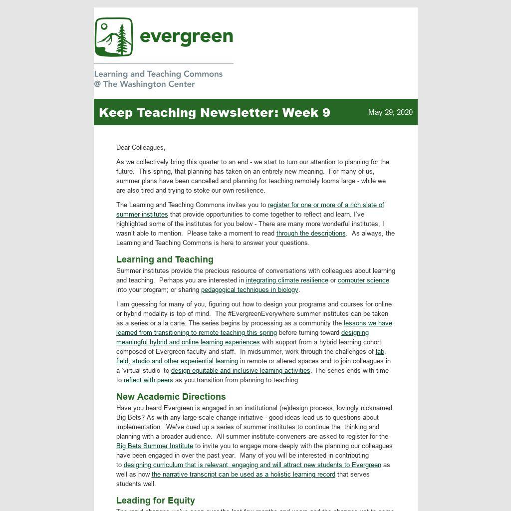 All faculty and staff are invited to attend the 2020 Resilient Leadership in Times of Change remote summer institute! (We had a good time at last year's institute -- and this one will be different and present different information, so plan to attend again.) To apply, answer a few short questions, intended to help ensure participants represent a good balance of roles at the college and a variety of approaches to college mid-level leadership.