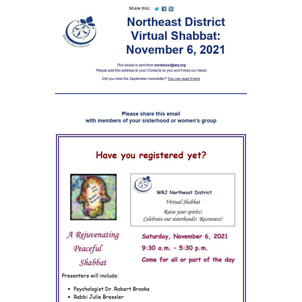 The Board of Directors includes the Executive Committee, Northeast District committee chairs, past Northeast District presidents, WRJ Board members residing in the Northeast District, and the president of each affiliated sisterhood or women's group in good standing, or her duly appointed representative.