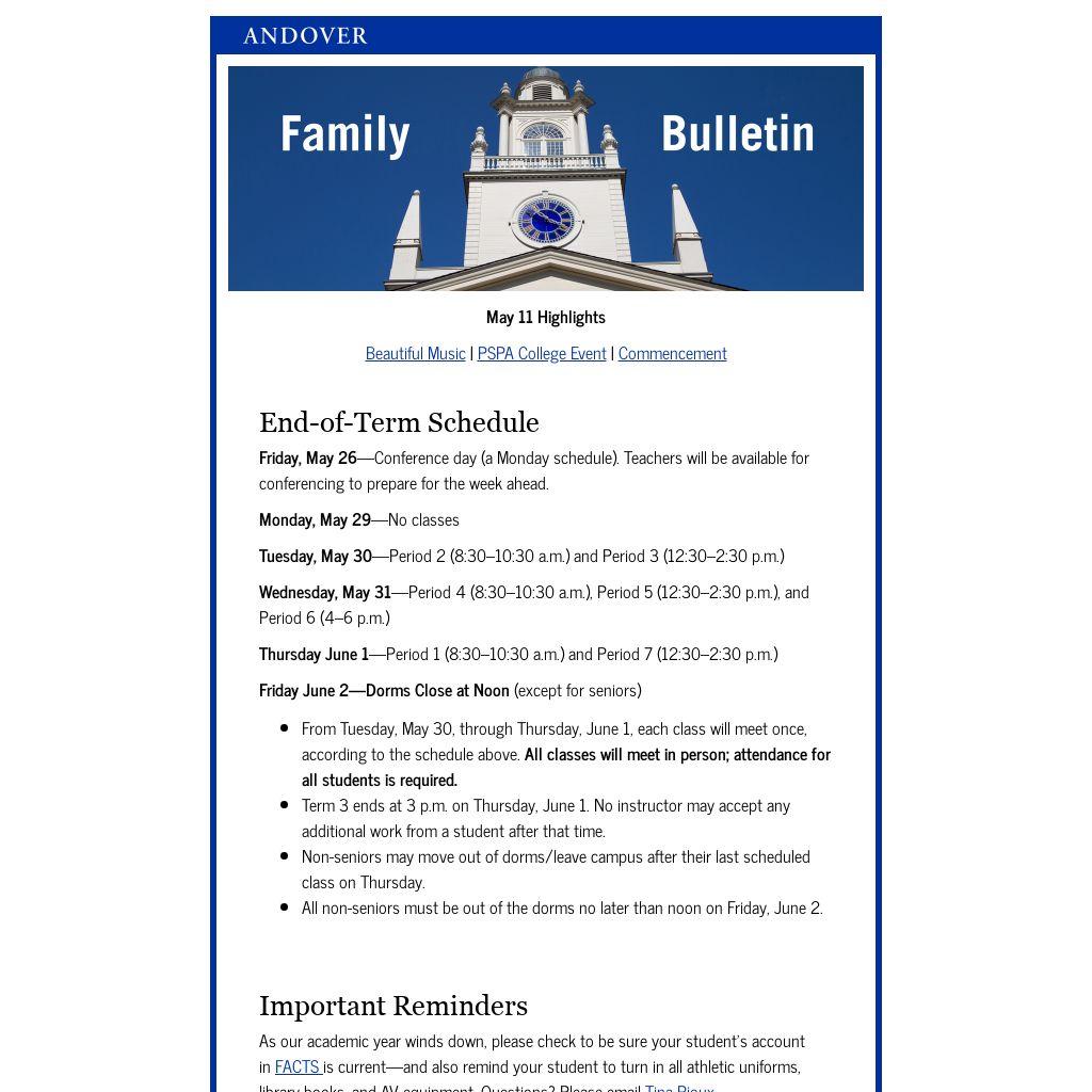 We are excited to welcome the families of seniors to campus in three weeks to celebrate Phillips Academy’s 245th Commencement. We hope the following information will assist with planning.