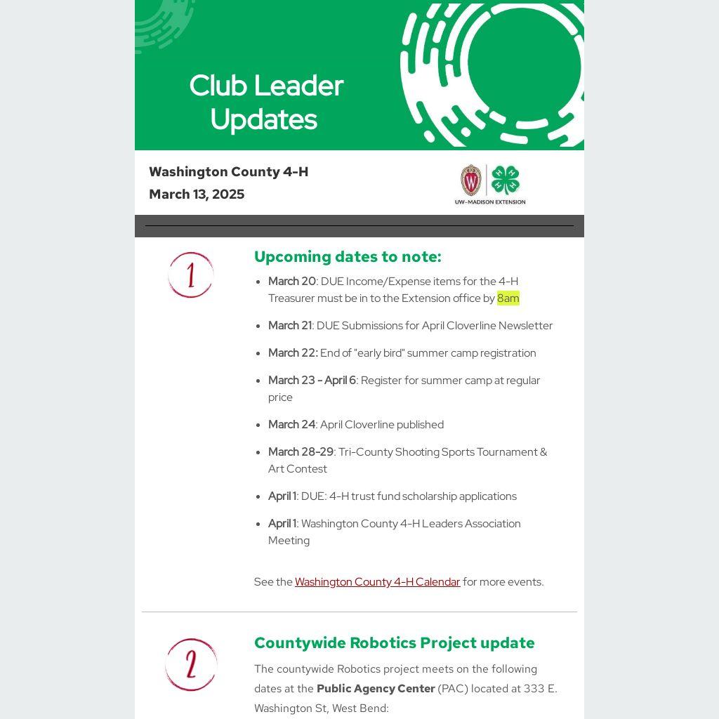 | - March 20: DUE Income/Expense items for the 4-H Treasurer must be in to the Extension office by 8am