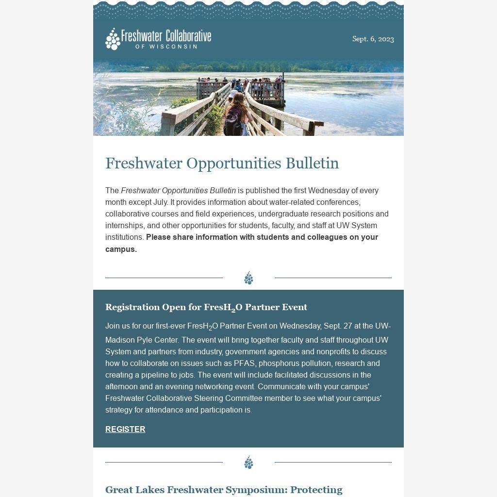 The Freshwater Opportunities Bulletin is published the first Wednesday of every month except July. It provides information about water-related conferences, collaborative courses and field experiences, undergraduate research positions and internships, and other opportunities for students, faculty, and staff at UW System institutions. Please share information with students and colleagues on your campus.