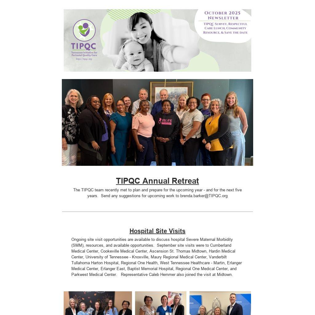Ongoing site visit opportunities are available to discuss hospital Severe Maternal Morbidity (SMM), resources, and available opportunities. September site visits were to Cumberland Medical Center, Cookeville Medical Center, Ascension St. Thomas Midtown, Hardin Medical Center, University of Tennessee - Knoxville, Maury Regional Medical Center, Vanderbilt Tullahoma Harton Hospital, Regional One Health, West Tennessee Healthcare - Martin, Erlanger Medical Center, Erlanger East, Baptist Memorial Hospital, Regional One Medical Center, and Parkwest Medical Center. Representative Caleb Hemmer also joined the visit at Midtown.