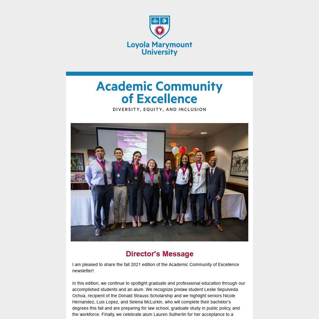Director's MessageI am pleased to share the fall 2021 edition of the Academic Community of Excellence newsletter! In this edition, we continue to spotlight graduate and professional education through our accomplished students and an alum. We recognize prelaw student Leslie Sepulveda Ochoa, recipient of the Donald Strauss Scholarship and we highlight seniors Nicole Hernandez, Luis Lopez, and Selena McLurkin, who will complete their bachelor’s degrees this fall and are preparing for law school, graduate study in public policy, and the workforce. Finally, we celebrate alum Lauren Sutherlin for her acceptance to a master’s degree program in nutrition, health span and longevity. I trust that you will enjoy reading about their achievements and aspirations.