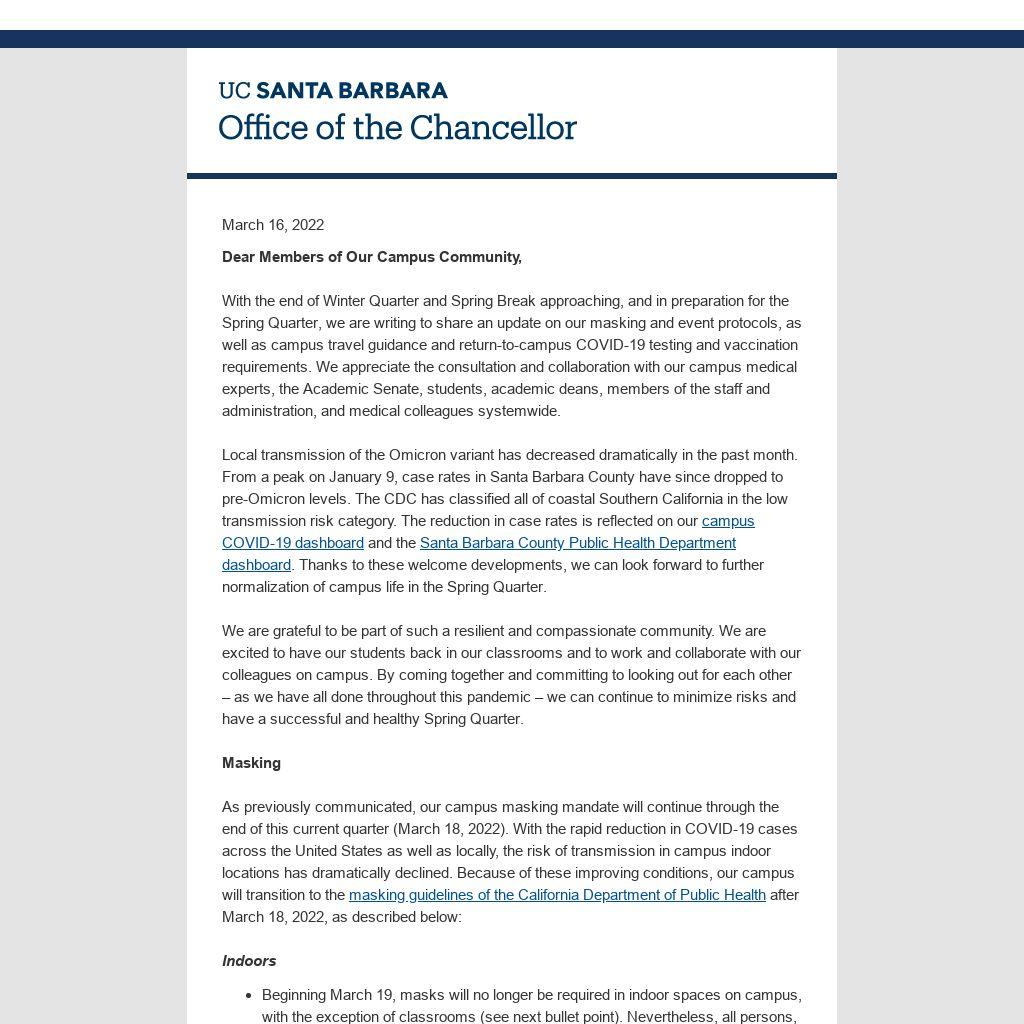 With the end of Winter Quarter and Spring Break approaching, and in preparation for the Spring Quarter, we are writing to share an update on our masking and event protocols, as well as campus travel guidance and return-to-campus COVID-19 testing and vaccination requirements. We appreciate the consultation and collaboration with our campus medical experts, the Academic Senate, students, academic deans, members of the staff and administration, and medical colleagues systemwide.
