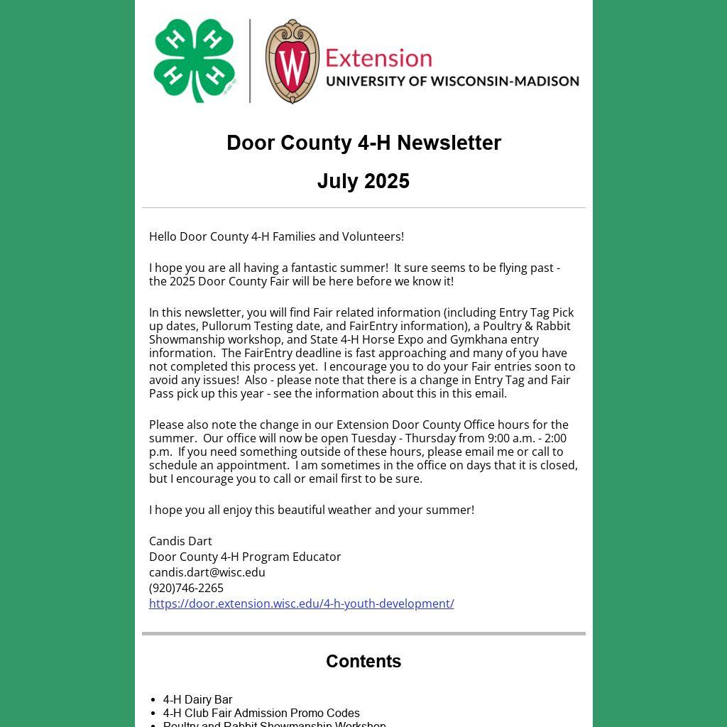 Premium Books: The 2025 Door County Fair Premium Books is now available! Printed copies are available at the Extension Door County office, but an electronic version can be found on the Door County Fair website: https://www.co.door.wi.gov/1028/Exhibitors.