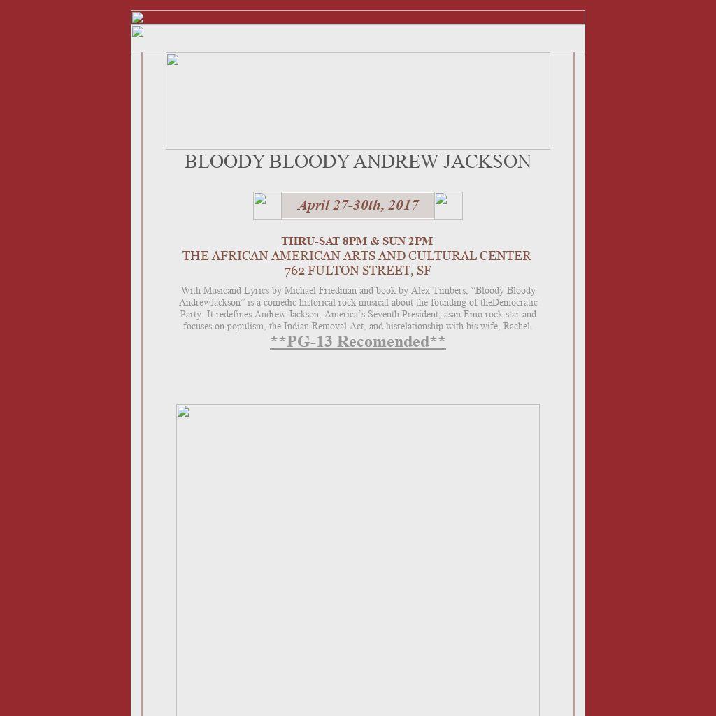 With Musicand Lyrics by Michael Friedman and book by Alex Timbers, “Bloody Bloody AndrewJackson” is a comedic historical rock musical about the founding of theDemocratic Party. It redefines Andrew Jackson, America’s Seventh President, asan Emo rock star and focuses on populism, the Indian Removal Act, and hisrelationship with his wife, Rachel.