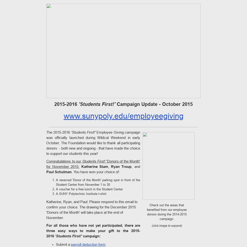 The 2015-2016 'Students First!' Employee Giving campaign was officially launched during Wildcat Weekend in early October. The Foundation would like to thank all participating donors - both new and ongoing - that have made the choice to support our students this year!