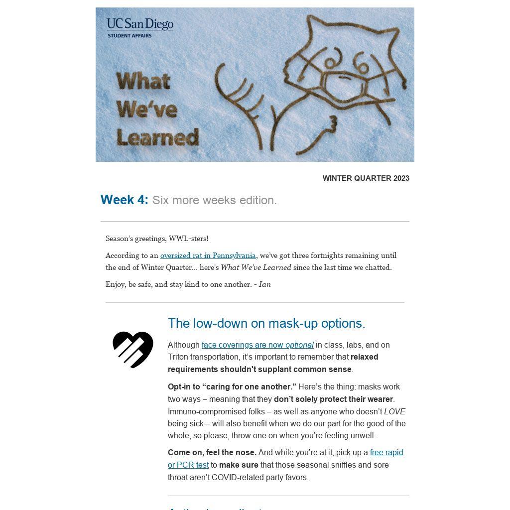 Spring Break, you off. For the third year running, we’re planning a week’s worth of fun, engaging, and educational opportunities on campus during the March 27-31 break. Let us know what type of offerings you’re interested in by emailing vcsa@ucsd.edu, and we’ll do our best to make it happen.
