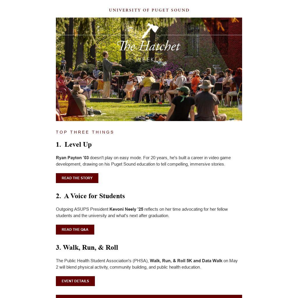 On April 30 at 4 p.m., Puget Sound will mark the last day of classes for the spring semester with a longstanding tradition—Pops on the Lawn. This outdoor (weather permitting) concert features the Symphony Orchestra and Wind Ensemble with student conductors. All are welcome to attend to celebrate the end of another academic year. If there's rain in the forecast, the performance will move to Schneebeck Concert Hall.