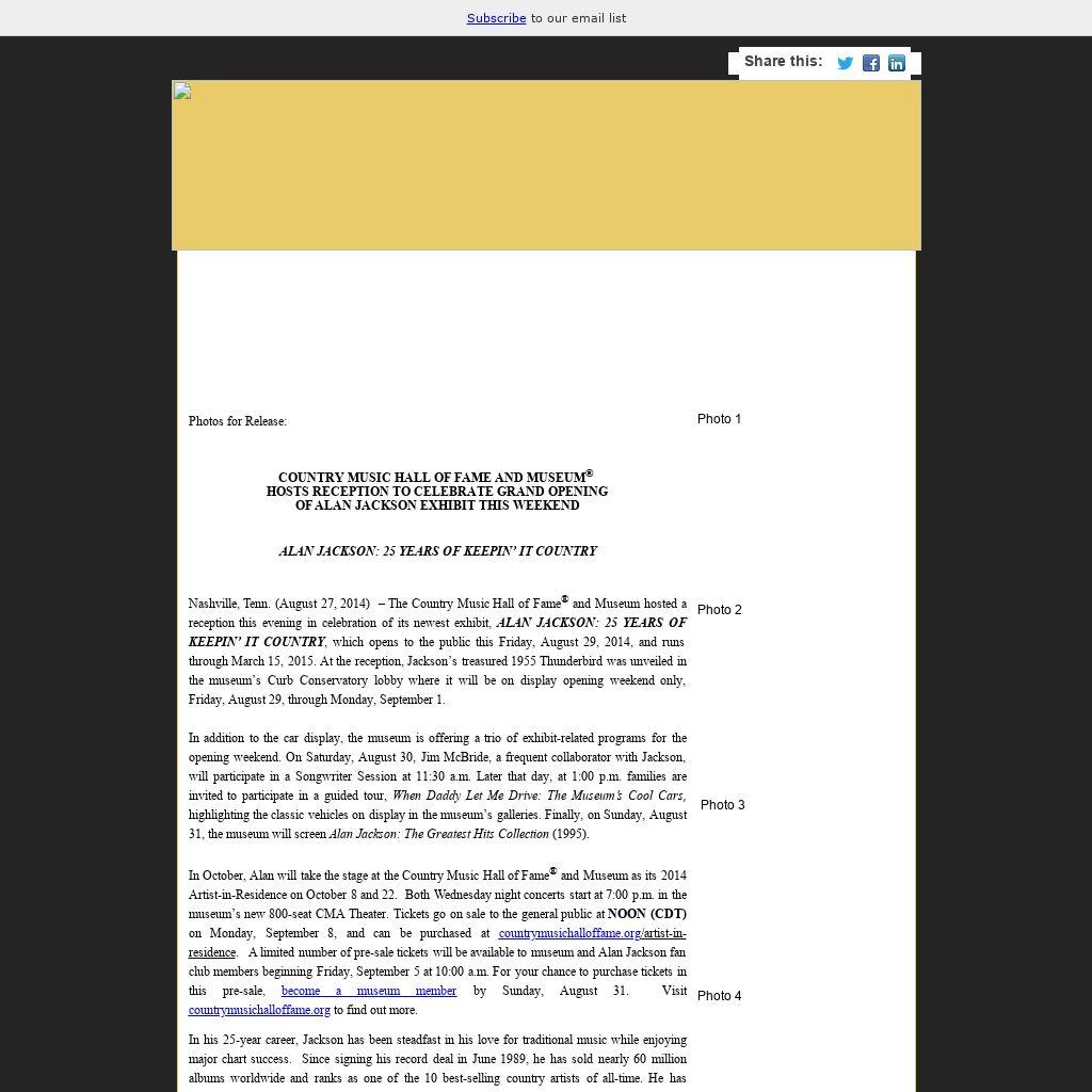 In October, Alan will take the stage at the Country Music Hall of Fame® and Museum as its 2014 Artist-in-Residence on October 8 and 22. Both Wednesday night concerts start at 7:00 p.m. in the museum’s new 800-seat CMA Theater. Tickets go on sale to the general public at NOON (CDT) on Monday, September 8, and can be purchased at countrymusichalloffame.org/artist-in-residence. A limited number of pre-sale tickets will be available to museum and Alan Jackson fan club members beginning Friday, September 5 at 10:00 a.m. For your chance to purchase tickets in this pre-sale, become a museum member by Sunday, August 31. Visit countrymusichalloffame.org to find out more. In his 25-year career, Jackson has been steadfast in his love for traditional music while enjoying major chart success. Since signing his record deal in June 1989, he has sold nearly 60 million albums worldwide and ranks as one of the 10 best-selling country artists of all-time. He has released more than 60 singles—registering 50 Top Ten hits and 35 #1s (including 26 Billboard #1s). He has earned more than 150 music industry awards—including 18 Academy of Country Music Awards, 16 Country Music Association Awards, a pair of Grammys and ASCAP’s Founders and Golden Note Awards. He is a member of the Nashville Songwriters Hall of Fame and the Grand Ole Opry.