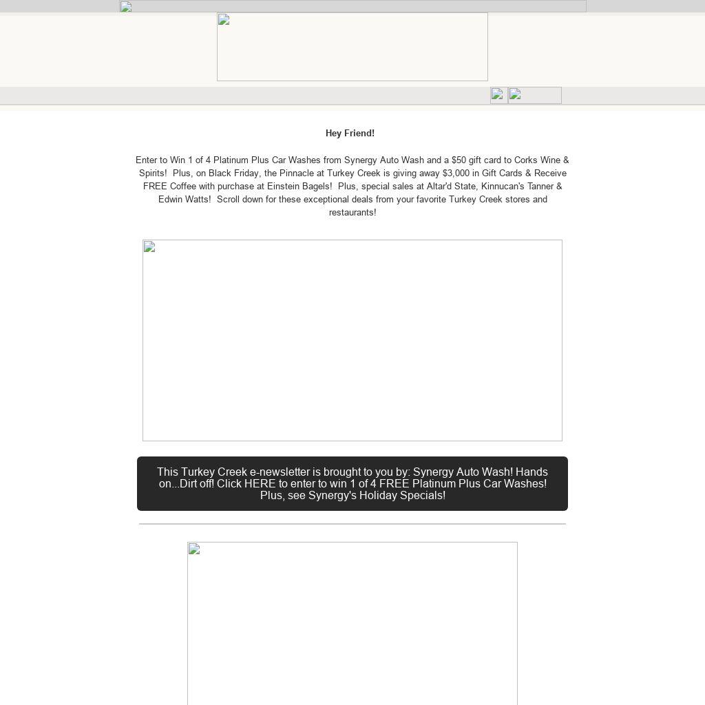 Enter to Win 1 of 4 Platinum Plus Car Washes from Synergy Auto Wash and a $50 gift card to Corks Wine & Spirits! Plus, on Black Friday, the Pinnacle at Turkey Creek is giving away $3,000 in Gift Cards & Receive FREE Coffee with purchase at Einstein Bagels! Plus, special sales at Altar'd State, Kinnucan's Tanner & Edwin Watts! Scroll down for these exceptional deals from your favorite Turkey Creek stores and restaurants!