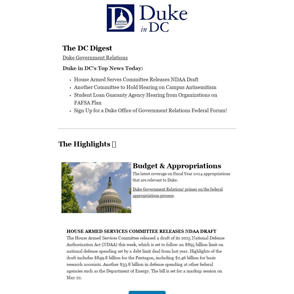 Have questions about federal issues impacting Duke? Duke's Office of Government Relations (OGR) is hosting weekly virtual office hours for members of the Duke community, "Federal Forums." Join us on Fridays at 10:00 AM to hear OGR staff give a quick rundown of the latest news out of DC of most relevance to Duke, answer questions, provide connections to resources and more! Register in advance to receive the Zoom link, and please include any issues you'd like to discuss.