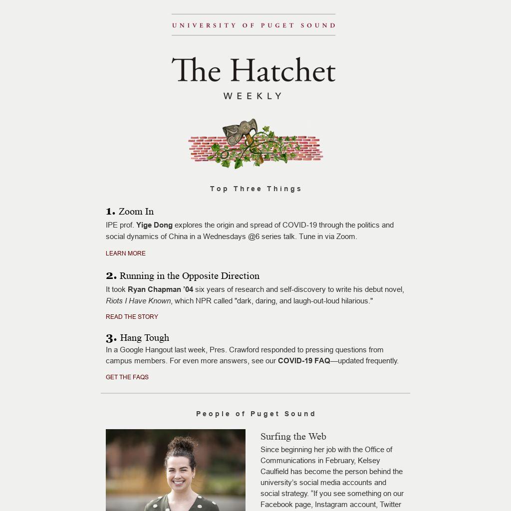 Since beginning her job with the Office of Communications in February, Kelsey Caulfield has become the person behind the university’s social media accounts and social strategy. “If you see something on our Facebook page, Instagram account, Twitter feed, or LinkedIn page, that’s probably from me,” she says. When she’s not surfing the web at work, she’s surfing the Pacific with her husband off the coast of Vancouver Island, British Columbia.