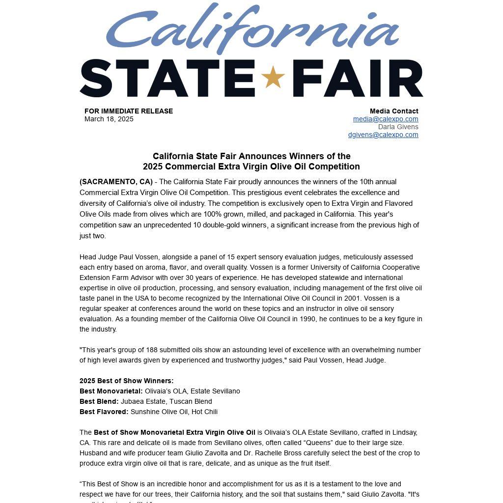 Fair attendees can explore an exhibit featuring award-winning extra virgin and flavored olive oils during the 2025 California State Fair, including complimentary tastings, educational classes, and opportunities to purchase olive oil directly from award-winning producers. For complete results and more information, visit www.CalExpoStateFair.com.