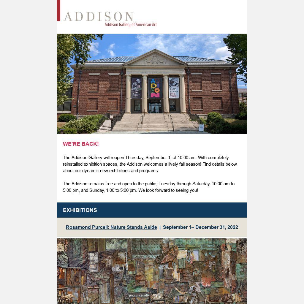 The Addison remains free and open to the public, Tuesday through Saturday, 10:00 am to 5:00 pm, and Sunday, 1:00 to 5:00 pm. We look forward to seeing you!
