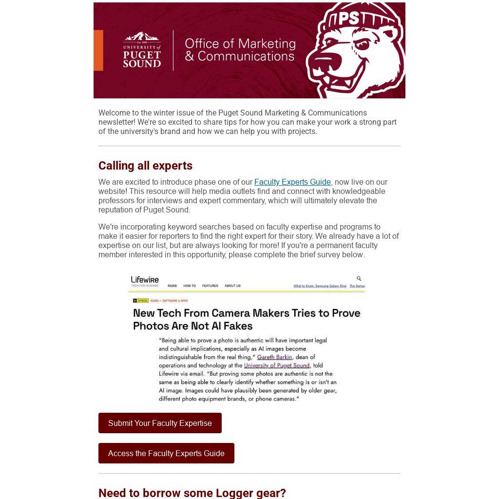 Welcome to the winter issue of the Puget Sound Marketing & Communications newsletter! We're so excited to share tips for how you can make your work a strong part of the university's brand and how we can help you with projects.