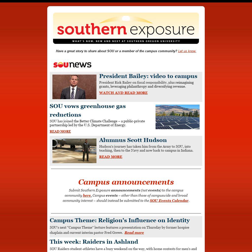 Submit Southern Exposure announcements (not events) to the campus community here. Campus events – other than those of campuswide and broad community interest – should instead be submitted to the SOU Events Calendar.