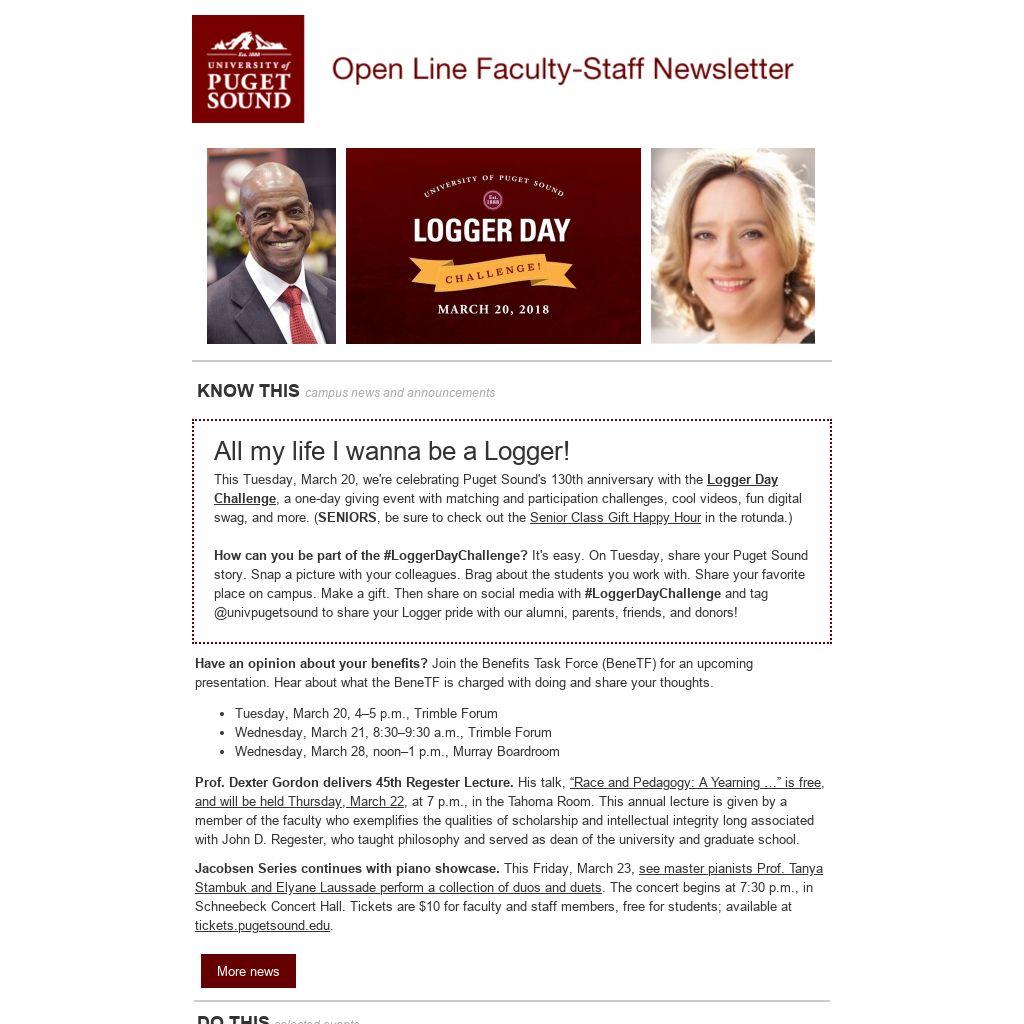 How can you be part of the #LoggerDayChallenge? It's easy. On Tuesday, share your Puget Sound story. Snap a picture with your colleagues. Brag about the students you work with. Share your favorite place on campus. Make a gift. Then share on social media with #LoggerDayChallenge and tag @univpugetsound to share your Logger pride with our alumni, parents, friends, and donors!