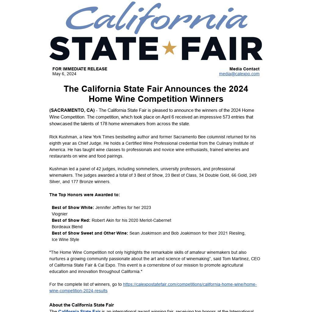 (SACRAMENTO, CA) - The California State Fair is pleased to announce the winners of the 2024 Home Wine Competition. The competition, which took place on April 6 received an impressive 573 entries that showcased the talents of 178 home winemakers from across the state.