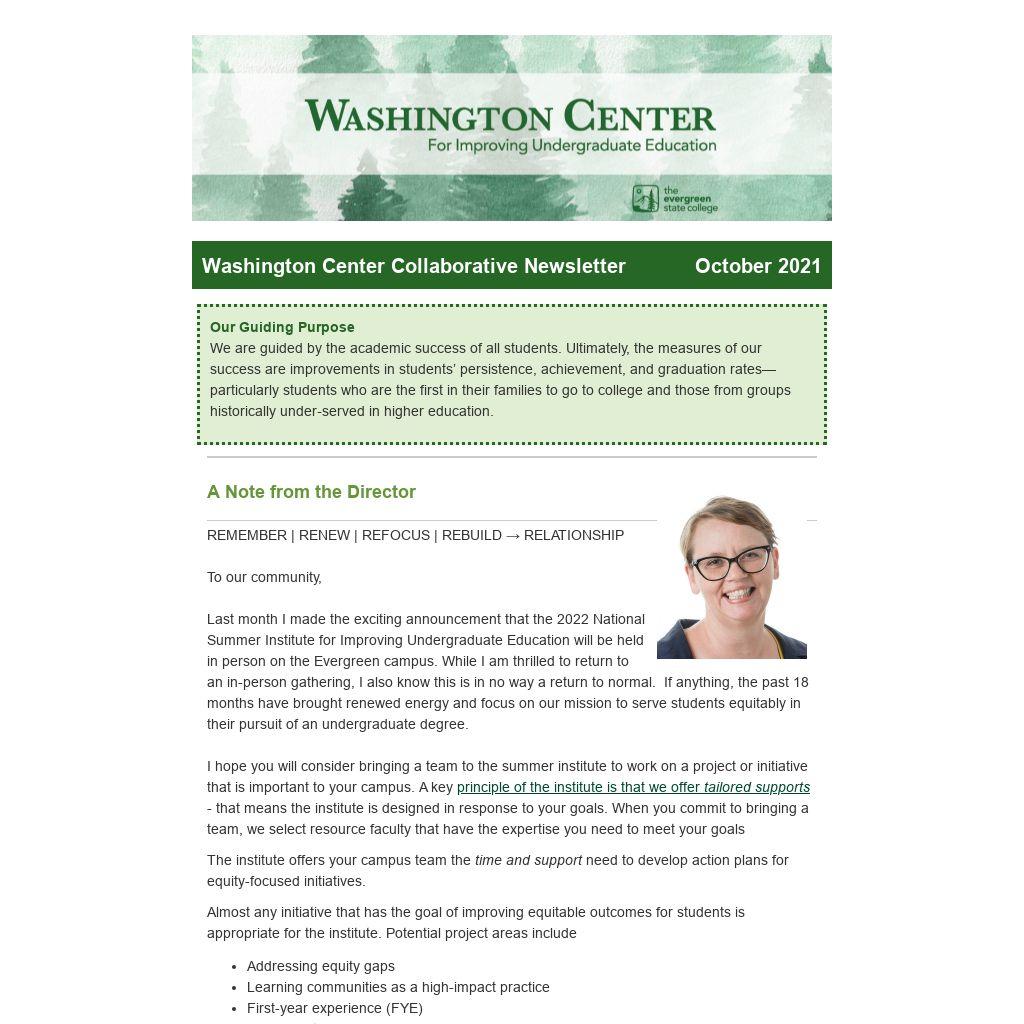 Last month I made the exciting announcement that the 2022 National Summer Institute for Improving Undergraduate Education will be held in person on the Evergreen campus. While I am thrilled to return to an in-person gathering, I also know this is in no way a return to normal. If anything, the past 18 months have brought renewed energy and focus on our mission to serve students equitably in their pursuit of an undergraduate degree.