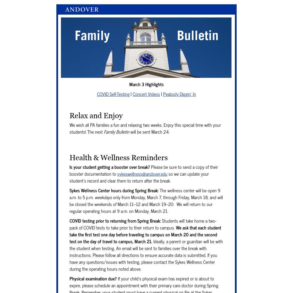 We wish all PA families a fun and relaxing two weeks. Enjoy this special time with your students! The next Family Bulletin will be sent March 24.