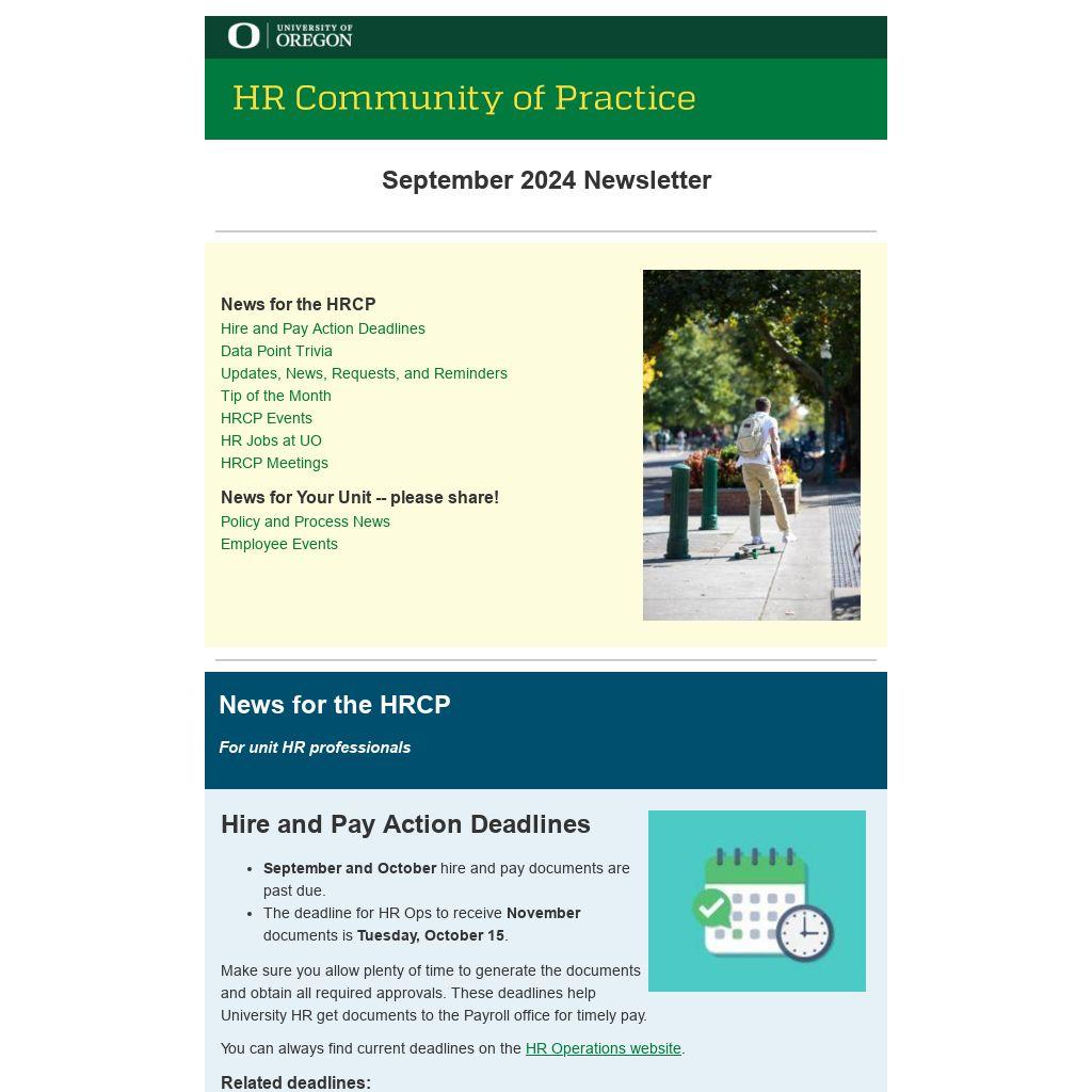 HR Operations and Payroll reminders: Make sure you take another look at the reminders from our September HRCP meeting. Important items include student employee to-dos, notifying HR Ops of department head and other faculty union exclusions, and a clarification on PERS retirement date vs. job termination date.