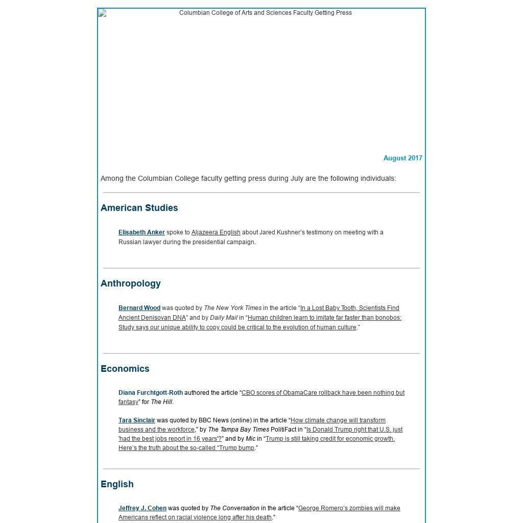 | | Among the Columbian College faculty getting press during July are the following individuals: