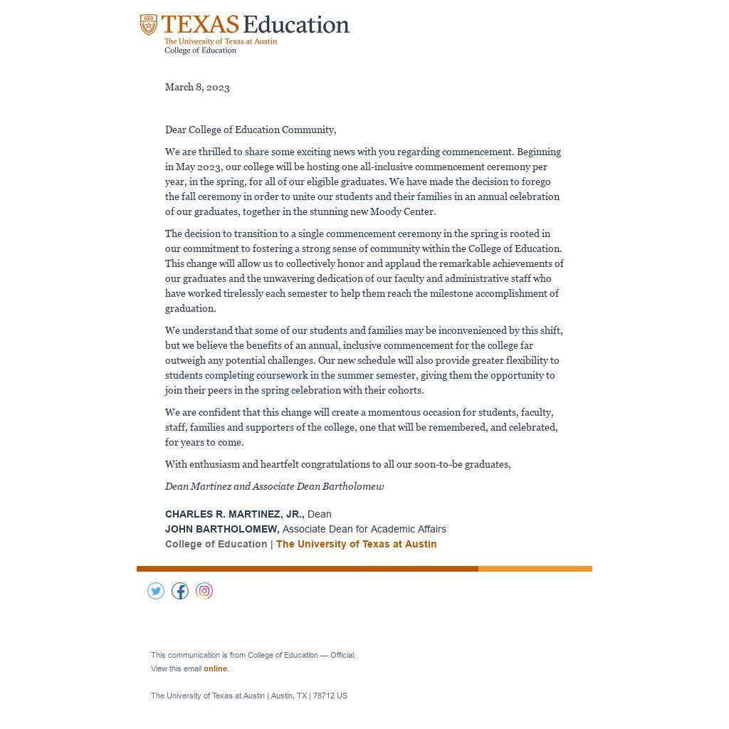 The decision to transition to a single commencement ceremony in the spring is rooted in our commitment to fostering a strong sense of community within the College of Education. This change will allow us to collectively honor and applaud the remarkable achievements of our graduates and the unwavering dedication of our faculty and administrative staff who have worked tirelessly each semester to help them reach the milestone accomplishment of graduation.