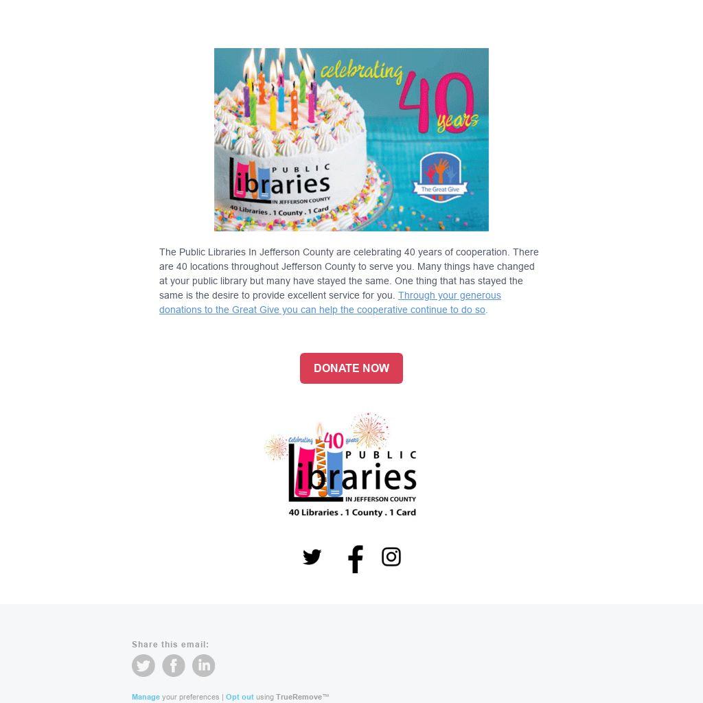 The Public Libraries In Jefferson County are celebrating 40 years of cooperation. There are 40 locations throughout Jefferson County to serve you. Many things have changed at your public library but many have stayed the same. One thing that has stayed the same is the desire to provide excellent service for you. Through your generous donations to the Great Give you can help the cooperative continue to do so.